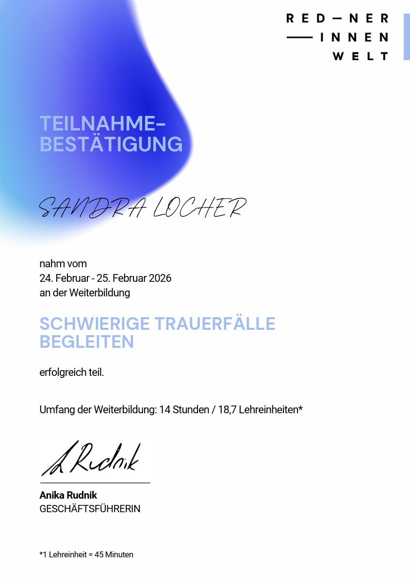 Diese 14 intensiven Stunden Weiterbildung bedeuten für mich nicht nur fachliche Vertiefung, sondern auch persönliches Wachstum. Gerade bei schwierigen Trauerfällen ist es mir wichtig, Menschen nicht nur würdevoll zu begleiten, sondern ihnen Halt, Orientierung und echte menschliche Nähe zu geben.